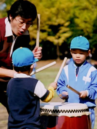その延長線上で和太鼓で遊ぼうや、リズムあそびなどもやっています。和太鼓も、子どもたちと一緒におはやしをつくって演奏します。