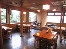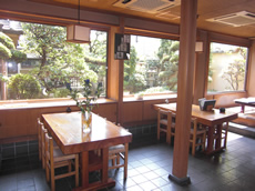 窓を大きくとり、庭が眺められて、テーブルもゆったりと配置して、くつろげる雰囲気を出しています。
