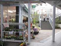北口改札の階段を下りると1階には、中庭の廻りに、花屋、ヘアーサロン、歯科、保育所、お好み焼きの店「道とん堀」、中国料理店「水晶楼」。